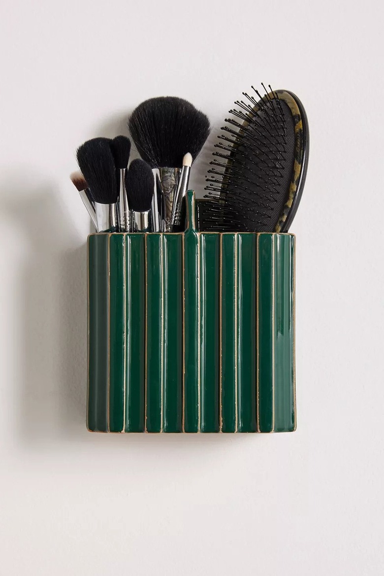 When you don't have enough sink space to store your bathroom staples, an eye-catching wall organizer might be the next best thing. This glossy, wall-mounted ceramic storage container is designed with a bisected interior for compartmentalizing makeup brushes, hair accessories, and other small items.