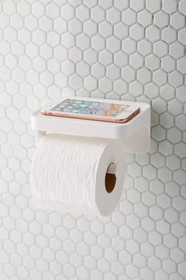 No bathroom would be complete without a toilet paper holder, so why not install one that provides extra surface space? This wall-mounted plastic toilet paper holder boasts a built-in shelf for setting candles, cell phones, and other little bathroom knickknacks.