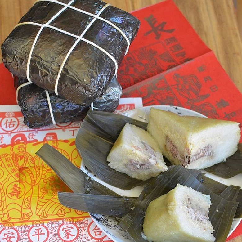 "At the center of Vietnamese Tet menus is banh chung, a special sticky rice cake filled with butter yellow mung beans and fatty pork," writes Vietnamese food blogger and chef Andrea Nguyen. "It's hearty yet delicately fragrant and stained green because it's wrapped in tropical green leaves (la dong in Vietnam and banana leaf and bamboo leaves abroad)."
