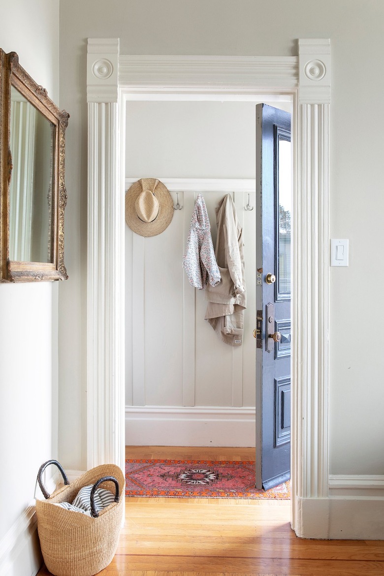 Hur updated the entry with a vintage mirror and a colorful runner from ABC Carpet & Home.