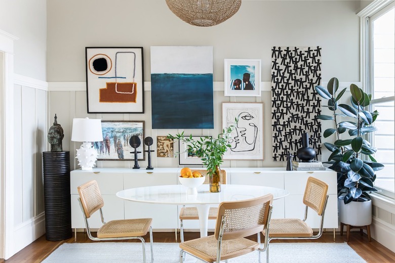 An array of artwork that the family found at LRNCE, Minted, the Poster Club as well as at galleries and abroad, create a colorful backdrop in the dining room. Rattan chairs and a pendant light by Leanne Ford for Target offset the sleek table and console.