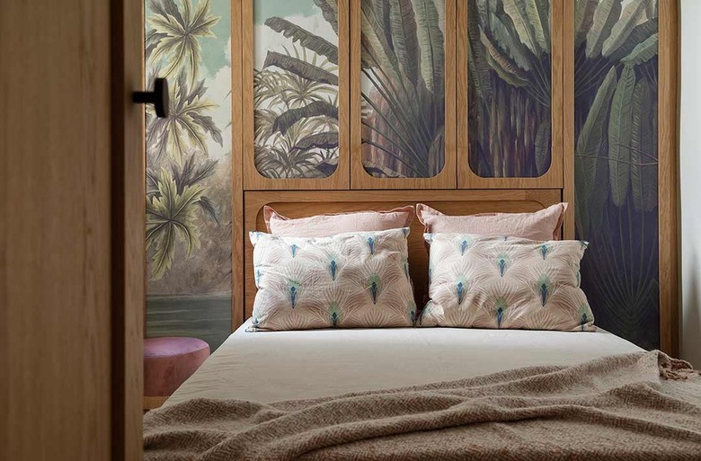 In the main bedroom, a cane headboard is set against a tropical Ananbô wallpaper. Prades installed simple oak shelves as a space-saving alternative to nightstands.