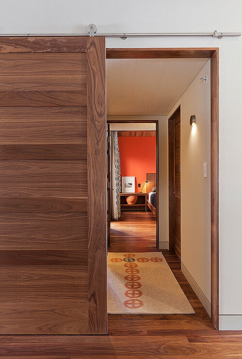 For a more subtle glow, consider a wall light. This lovely hallway from Gamble + Design features a sconce with a circular cover plate that casts light downward. It gives the space a sense of warmth that adds to the cozy feeling created by all the wood tones. Even the stainless steel barn door track just works. Pro tip: To control the amount of light in the space, consider installing a dimmer switch.