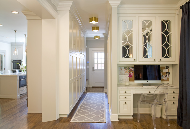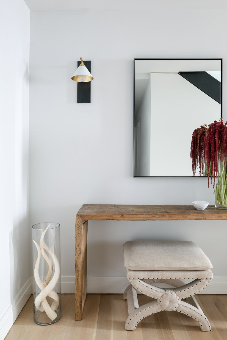 This hall has a few traditional touches thanks to the wall trim and ceiling molding, but the opaque wall sconces add the perfect amount of modernity. And even though the natural light is abundant, the milk glass globes will pull double duty by illuminating the area and serving as an on-trend accessory, thanks to the extended, intersecting arm.