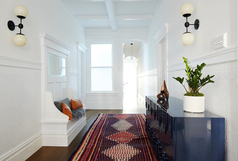 Want a subtle yet sufficient way of lighting your hallway? A small wall-mounted fixture with a shade will do the trick, and keep the space looking spiffy. And in this case, the more petite the better. To get the look, take cues from this Chango & Co. design which features a soft white wall color paired with a wooden entryway table, natural wood flooring, and neutral-toned accessories. Throw in a vibrant floral arrangement for a pop of color.