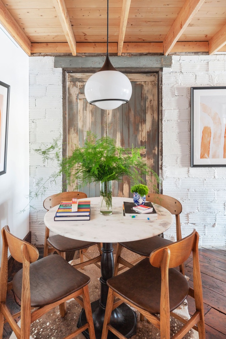 To create some interesting juxtaposition, you can choose a pendant light with a modern feel to punctuate a throwback space. For instance, the team at Scout & Nimble went with a midcentury modern fixture from Mitzi to grace this wood and brick-detailed office space.