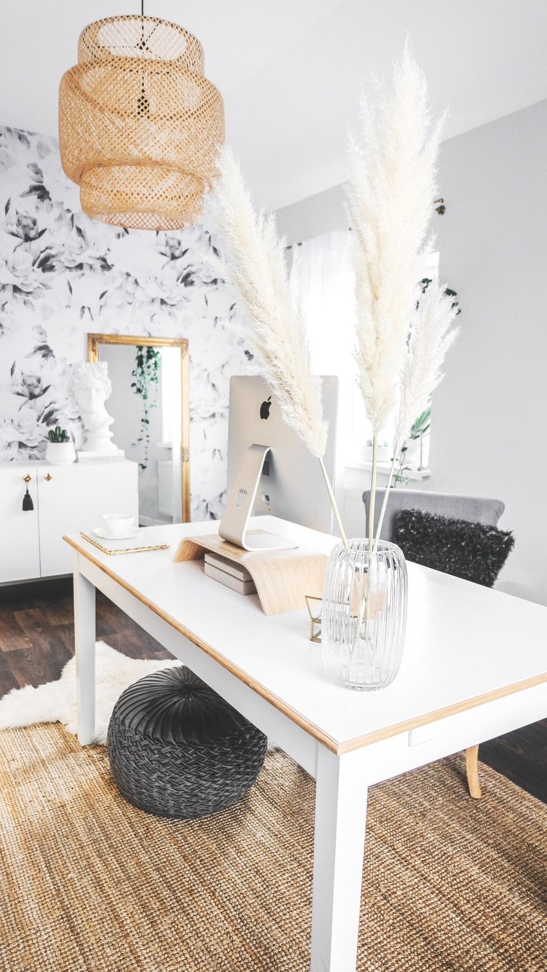 To prevent your office space from looking too serious, you can choose a bamboo pendant light to lighten the mood, no pun intended. Alongside feminine floral walls and a simple pampas grass arrangement, this IKEA fixture picked by Liv of Livette's Wallpaper acts as a free-spirited, bohemian accent.