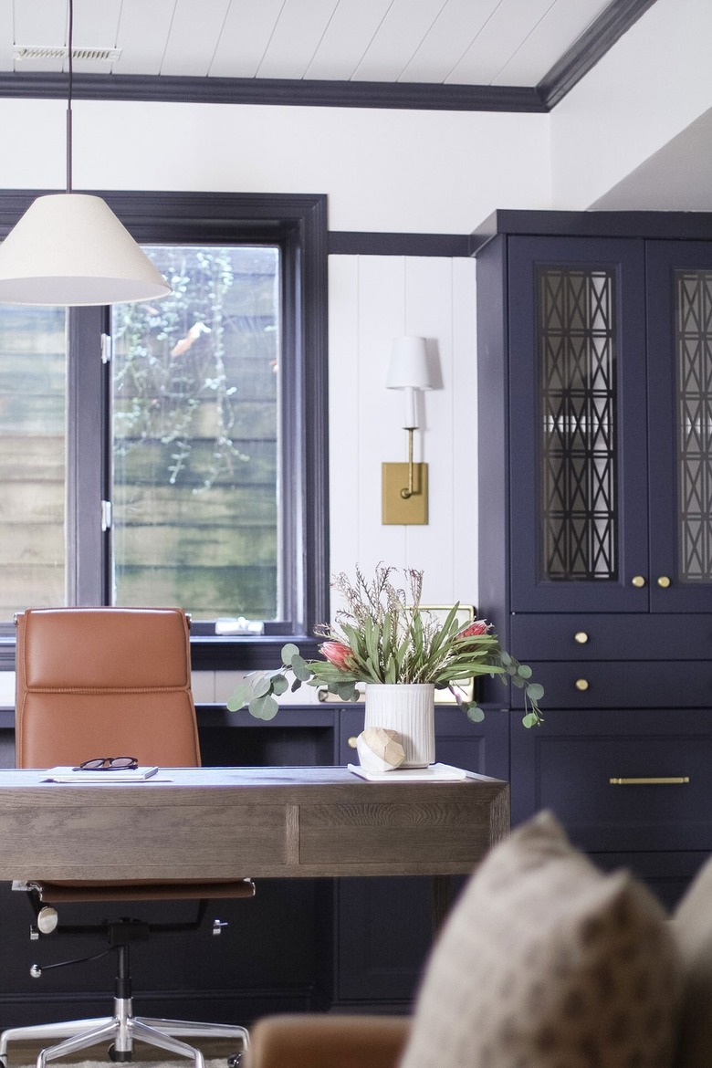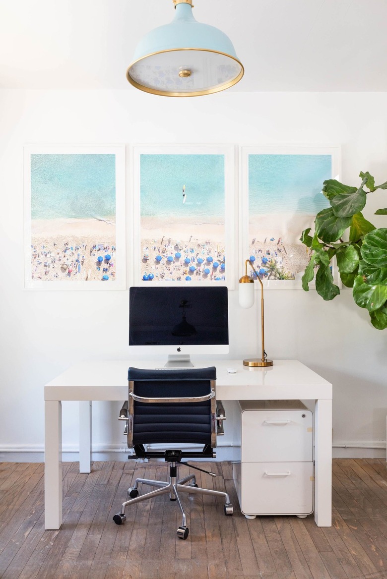 Although black and brass lighting is on-trend at the moment, you can feel free to play with color when it comes to your office lighting. An industrial pendant in blue from Hudson Valley is clearly the best choice for this coastal Gray Malin office.