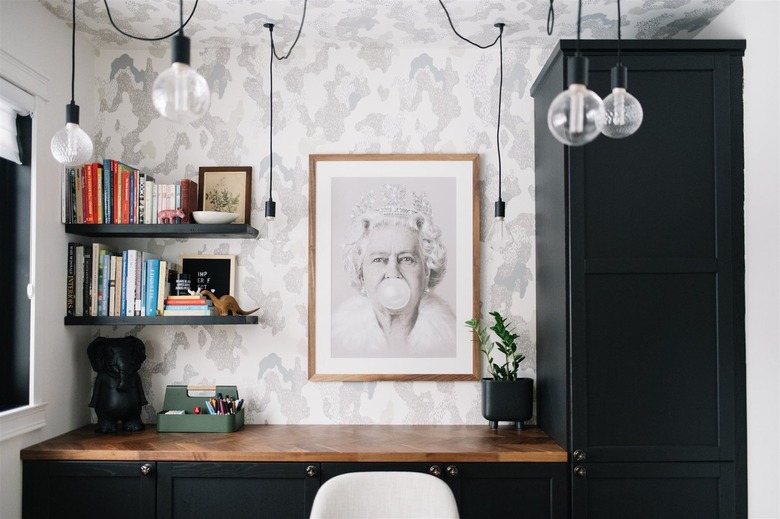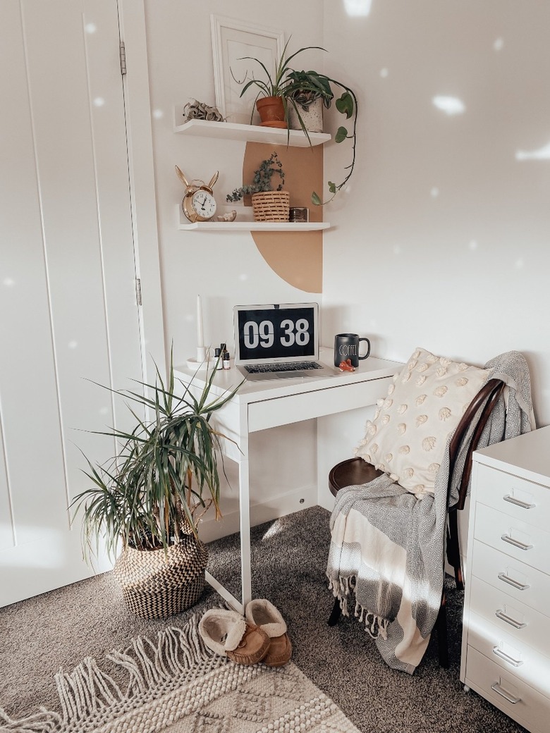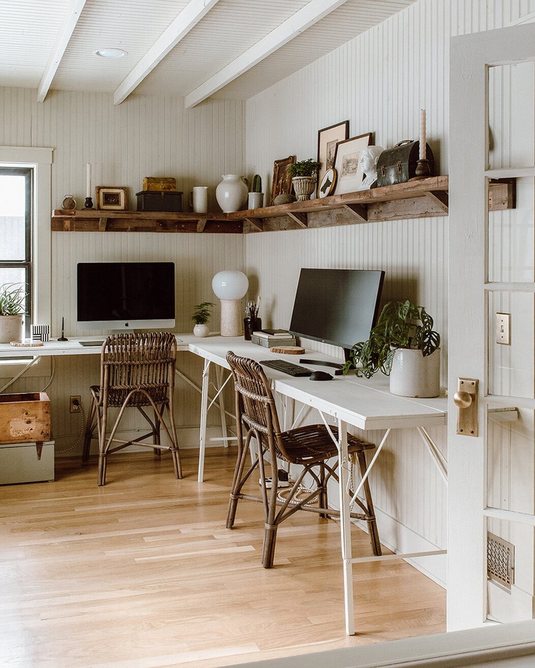 For a boho touch that brings a little bit of quirk to your home office, hang unfinished wood shelves at varying heights on the wall, creating a cool look that's purposely unbalanced. The shelving in this workspace designed by Lucy of Craftberry Bush lends a free-spirited vibe made even better with houseplants and unique decor.