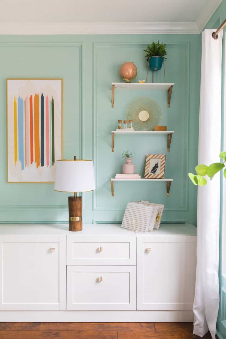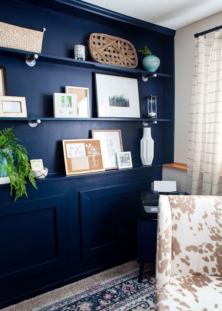 To create a truly monochromatic home office idea, paint your wall shelving the same color as your wall, à la this setup belonging to Melessa of My Daily She. The end result is a cohesive appearance that provides the perfect backdrop for displaying wall art and decorative objects.