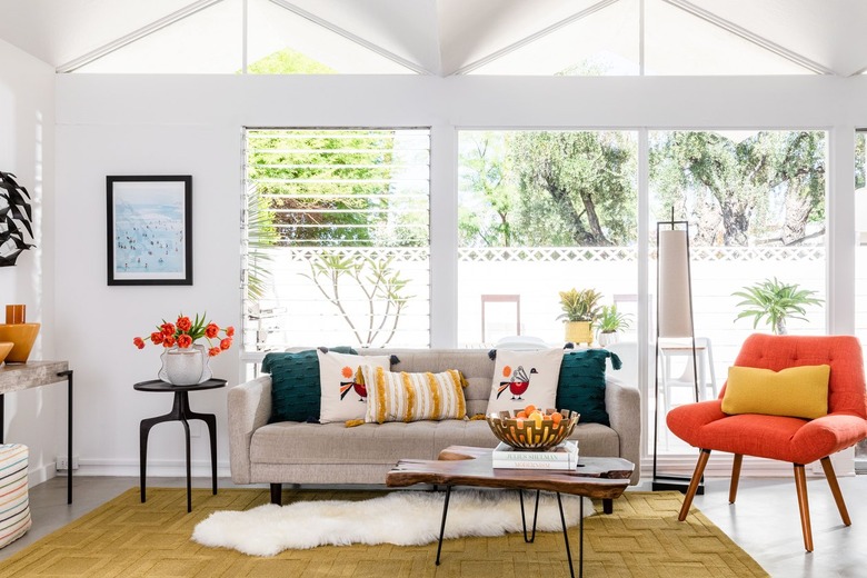 Adding bold finishing touches — like wooden bowls as wall decor or a colorful rug that defines the accent colors of the whole space — seals the "lived in" look without the actual time (or money) spent.