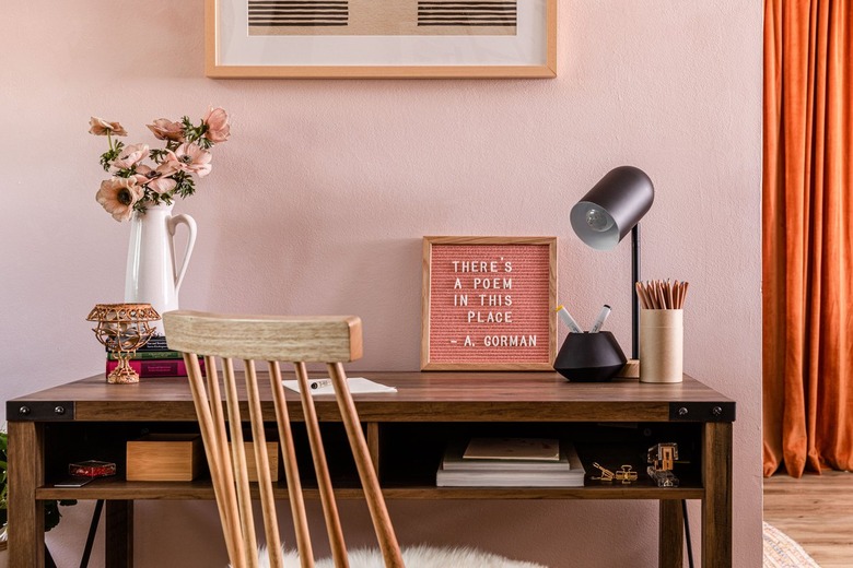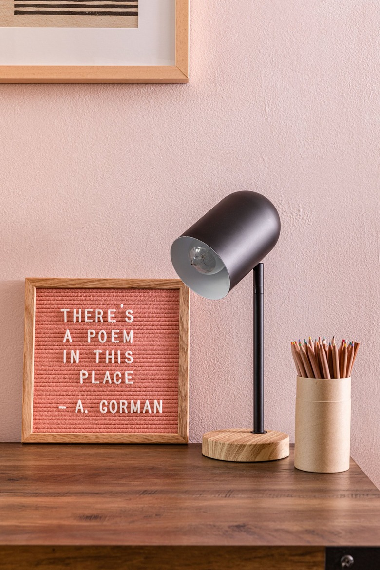 Avoid the urge to cover your new wooden desk with every office essential you can find — you want your space to feel motivating and uplifting, not overwhelming. A chic black lamp provides additional light and a pretty felt letter board adds the motivation factor. And keeping a jar of pencils within arm's reach is never a bad idea.