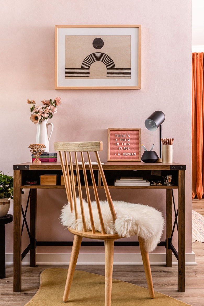 You don't need an entirely separate room to set up your office, but you do (ideally) need a worktop. With a wooden chair plus a plush blanket and rug, this desk space feels streamlined yet still warm and cozy. An abstract statement art piece further helps separate this area from the rest of the room.