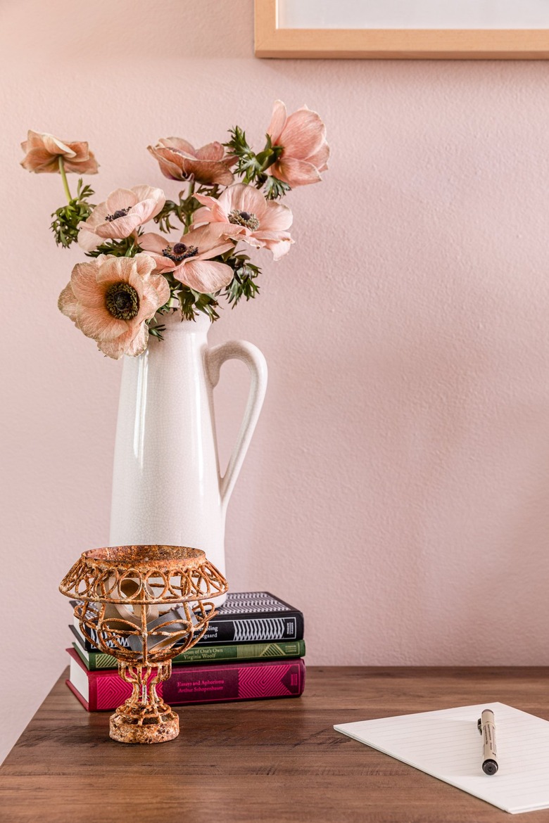 Lastly, adding a few colorful books and a vase with flowers (fresh or faux) can help give your desk a bit more life, without making it feel overcrowded. And a brassy, ornate vase makes a great covert storage space for little odds and ends.