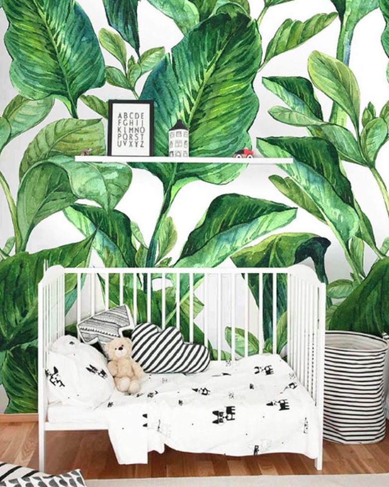 Add a little tropical touch to your tiny tot's room with a palm patterned wallpaper mural like this one. A white crib will be the perfect contrast against a bold print, and your little one will feel like they're on vacation.