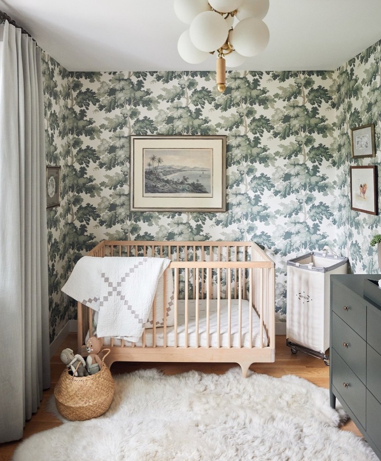 Follow Prospeft Refuge's lead, and add a pastoral touch to your nursery with wallpaper that will make it feel like your tot is napping under the branches of a tranquil tree. For extra points, incorporate a complementary green changing station and a plush rug.