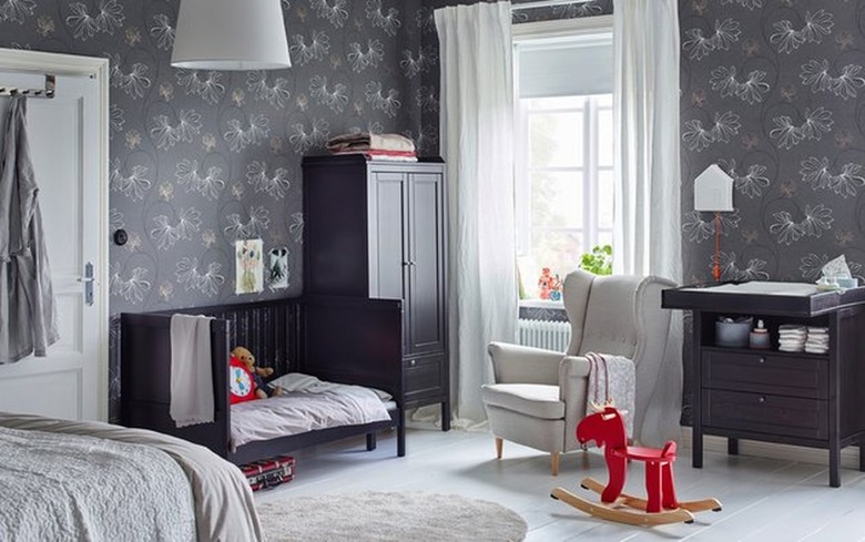 There's no rule that says your nursery design has to be light and bright when it comes to color. In fact, a gray baby room with wallpaper, a modern black crib, and matching changing table will feel super stylish. Even adults will love it.