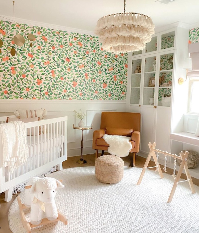 Add a fruit print to your little one's room if you're want to make it feel super sweet. Take this cute baby nursery. It's even more precious thanks to a citrus-themed wallpaper design and wainscoting. And for an extra adorable touch, the pattern continues inside a set of built-ins that holds decor and mementos.