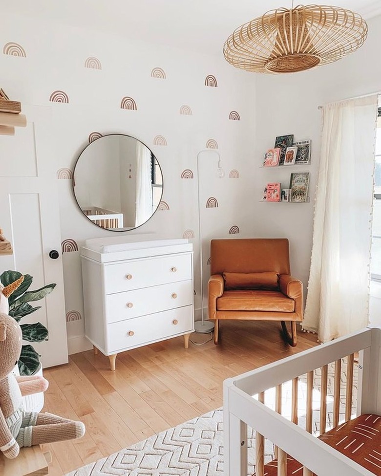 Perfect for a space that features modern home decor, this nursery wallpaper has a cute abstract pattern that perfectly complements a midcentury modern crib. Try a removable wallpaper style that will be easy to change out as your child gets older.