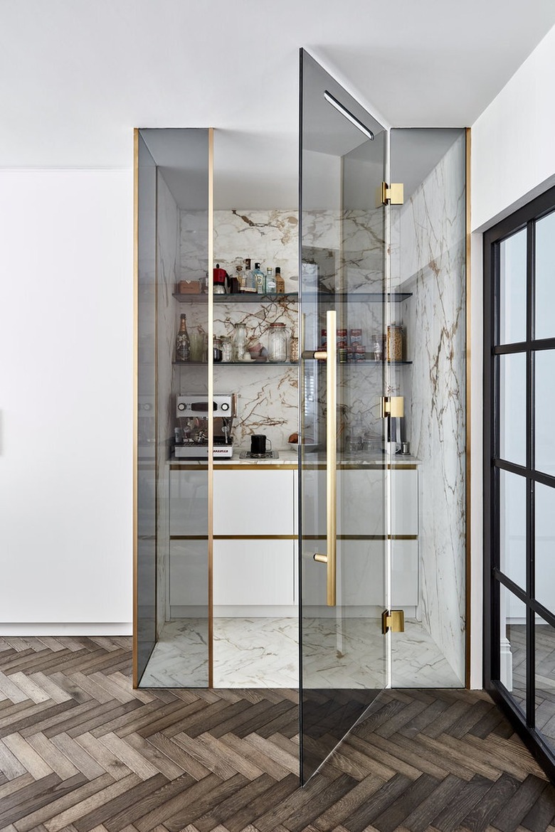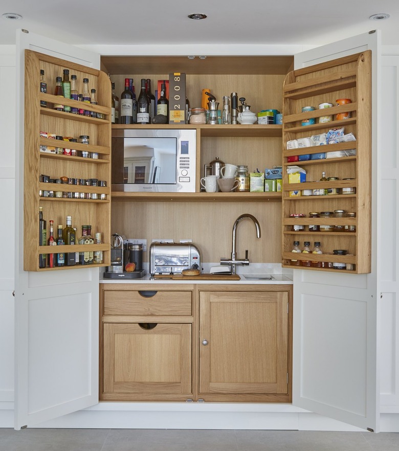 Have you ever dreamed of having your very own larder or pantry á la Downton Abbey but don't have the space? Well, an appliance garage meets pantry-style cupboard might just be the next best thing. This classic kitchen by Griggs and Mackay features an area for the sink, toaster, coffee machine, and microwave. But it also makes use of the doors as a spice and condiment rack. Clever, right?