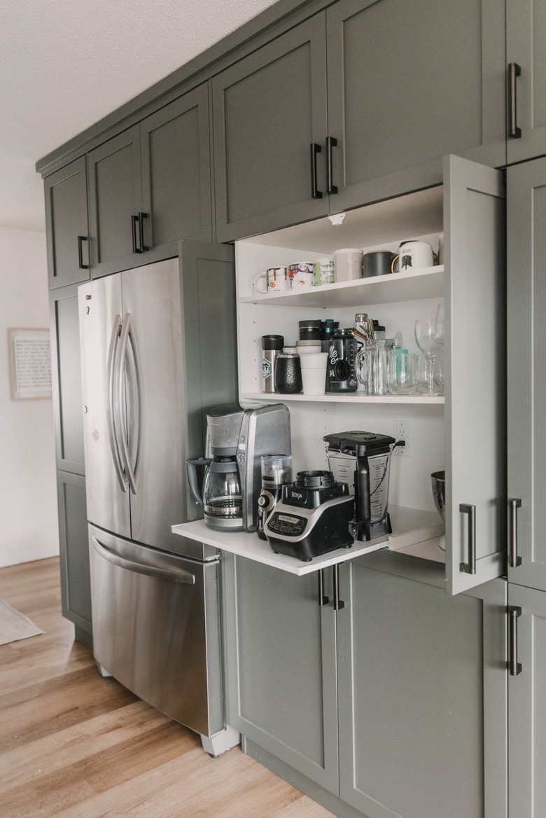 One problem with kitchen appliance garages? You can potentially damage your cabinets with steam if things haven't been set up correctly. Colleen of Lemon Thistle came up with a solution for this by creating a DIY pull-out shelf. This hack lets her use the coffee maker without setting it up on the counter or damaging the cupboards. You could try this in your existing kitchen before taking the plunge for something more bespoke.