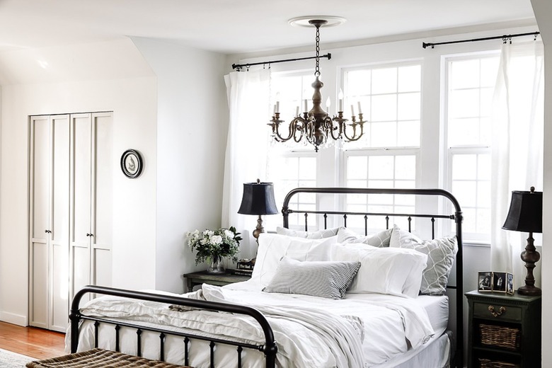 When space is at a premium, look up. You can still get your favorite farmhouse decor elements into a tiny bedroom, especially if you hang the light fixture from the ceiling. In this small farmhouse bedroom, the rustic chandelier creates a warm and inviting feel but takes up zero floor or wall space. It also perfectly complements the metal bed frame.