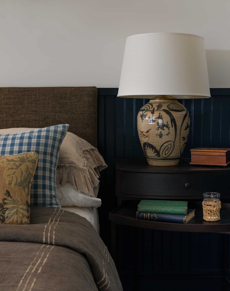 It's all about being multifunctional when it comes to small farmhouse room ideas. Pick pieces that really pack a punch. This beautiful farmhouse lamp does more than just light the space. It also adds some flair and doubles as an art piece. You won't need to clutter up your small side table with any other trinkets if you're using a decorative fixture like this.