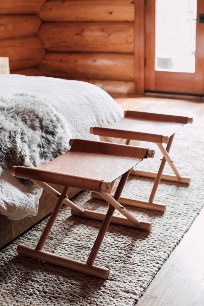 What we love about this particular farmhouse look is that the wooden and leather stools can easily be folded up and tucked away to save floor real estate. This is a great space-saving hack when you have a small bedroom. Consider pieces like this or foldaway tables. Then slide them right under an iron bed frame when necessary. Want another country living bedroom piece? Go for a barn door! It'll add so much character without taking up extra space.