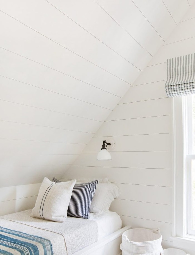 Your small farmhouse bedroom will look beautiful when outfitted in light, neutral paint colors and textiles that keep the space open and airy. Plus, you can't go wrong with white walls covered in shiplap. They combine rustic and minimalist touches in the best way.