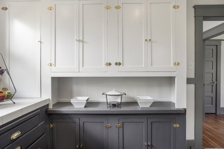 First things first, you need to identify the material and style of your cabinets — this will determine the type of paint needed, overall project involvement, and the results. Certain materials — like wood, MDF, and faux wood — can easily be sandpapered, enabling a new coat of paint to adhere more effectively. Laminates don't absorb top coats well, so they require a special bonding primer and paint made for non-porous surfaces. Even then, results are often mediocre and temporary. If you have plastic laminate cabinets that you'd like to salvage, speak to an expert who can guide you through the process. If you have metal cabinets, use an exterior-grade primer and paint that are formulated specifically for metal.