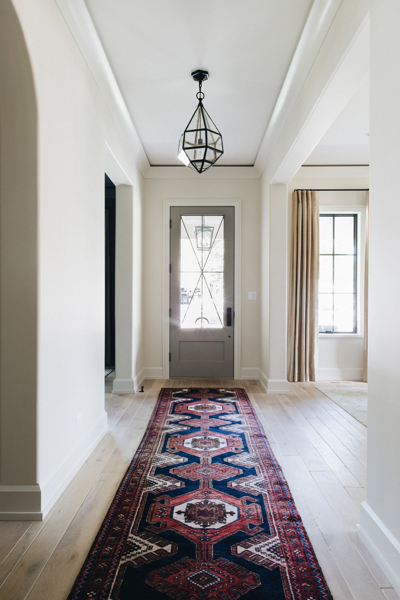Turn things up a notch with a vibrant hallway runner. We love the simply elegant light fixture and surroundings in this entry hall from Kate Marker. They create room for the regal rug to shine. Both beautiful and durable, a vintage runner like this will not only look great but will also protect high traffic hallway floors in a busy family home.