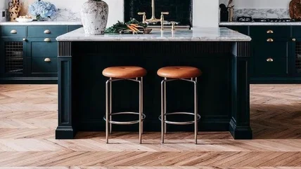 4. Designed by Steve Cordony, there's a lot to love: the black cabinetry, the parquet floors, the marble, the brass fixtures ... the fireplace! We imagine ourselves sitting on the leather barstool, red wine in hand, while our crush serves us gourmet cheeses and bread. But all of this happens after they've harvested those tall branches from their garden in order to impress us. It works.