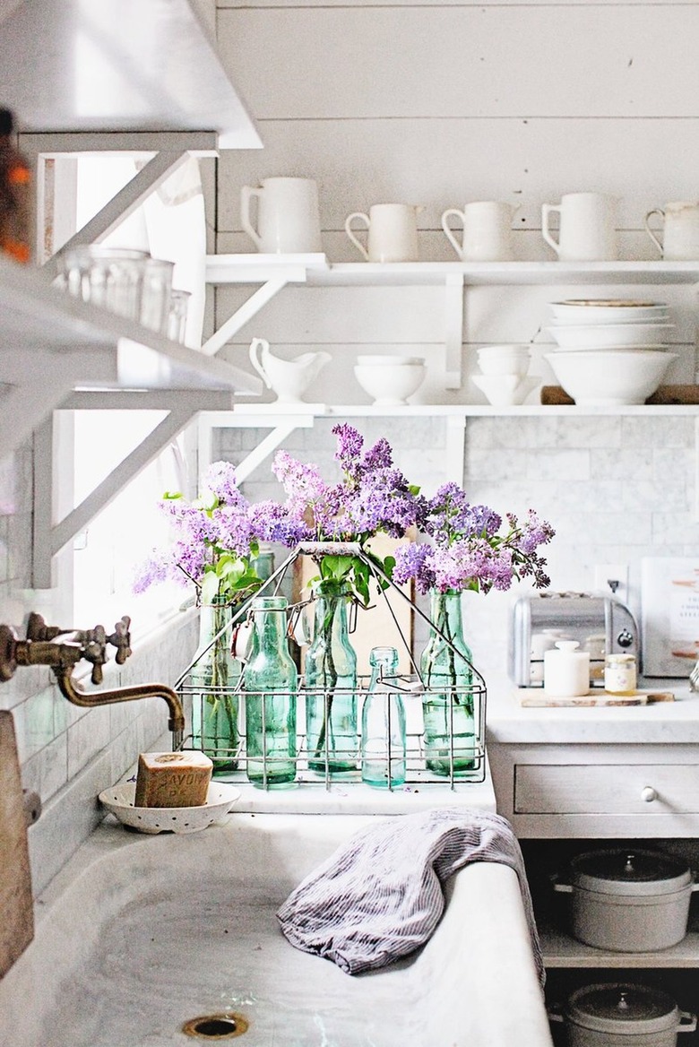Take advantage of open shelves by allowing them to double as a display space for an array of design-forward dishware. Enamel pitchers, stoneware dishes, and ceramic bowls all fit in with a cottage kitchen theme. Take things a step further, like this striking setup from Dreamy Whites, and bring in fresh flowers (lilacs and lavender are a shoo-in for the look) and a marble subway tile backsplash to complete the scene.