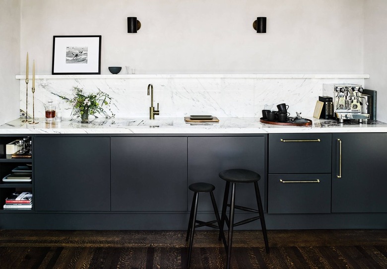 If there is a predominant veining color seen throughout the marble in your cook space, consider reinforcing that hue with the help of the other features in your space. In this modern kitchen showcased by DSHOP, the black veining seen on the countertops, backsplash, and sink is echoed in the light fixture, faucet, and cabinetry.