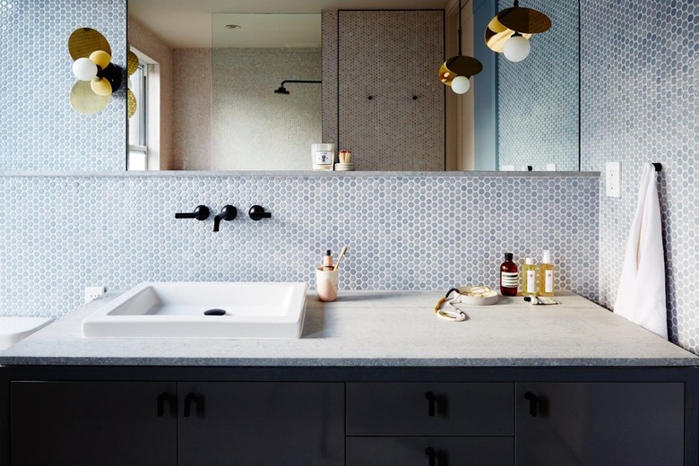 Think outside the tile box with a round mosaic backsplash to add personality and a unique spin to your interior design scheme. Although subway tile is a ubiquitous bathroom staple, follow the lead of GRT Architects and consider a scaled-down penny tile in varying shades of blue. Pair with brass wall sconces and black hardware for a look that's fresh and contemporary.