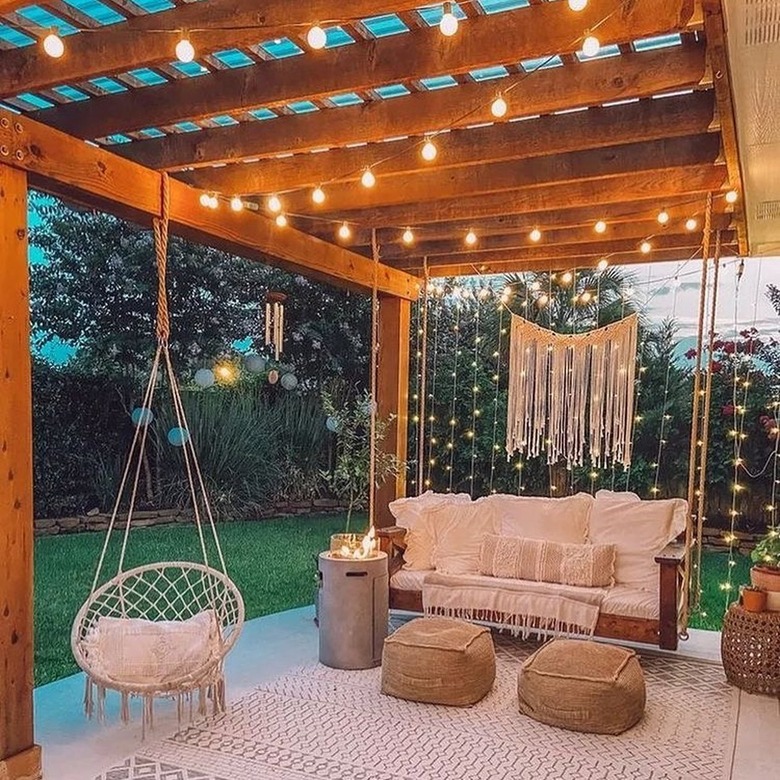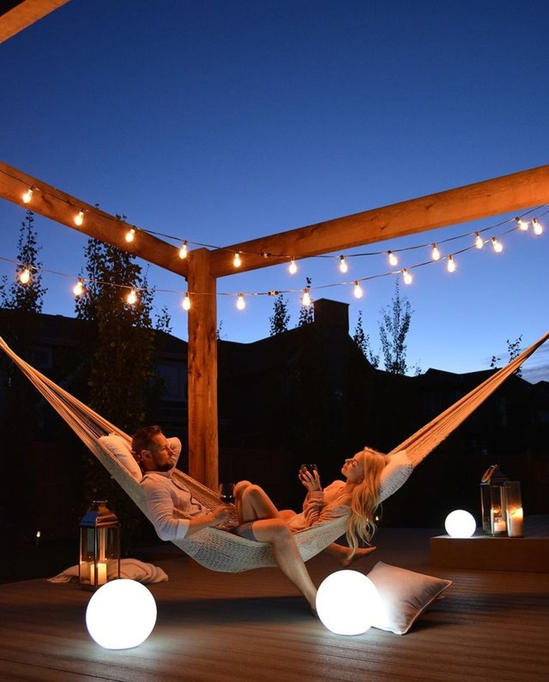 Underneath an open-roof pergola, @yellowleafhammocks shows a single hammock surrounded by glowing orb lights, lanterns, and string lights. This proves that one hammock and some great lighting can make all the difference in an outdoor space (especially at night).