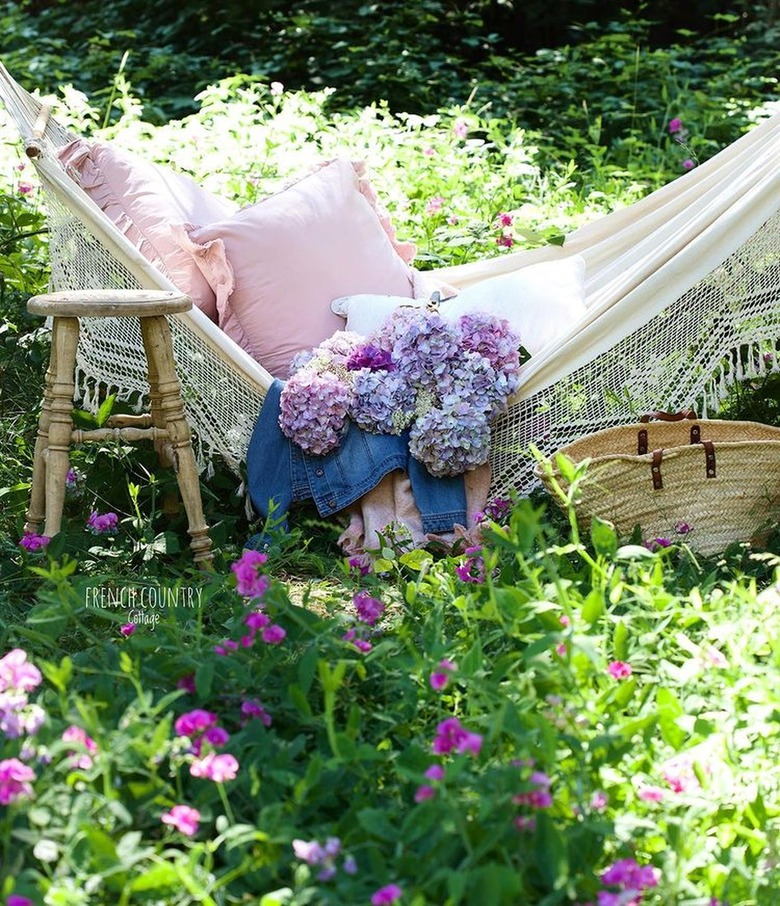 We're in love with @frenchcountrycottage's simple garden setup featuring a white hammock, stool side table, cozy pillows and throws, and plenty of hydrangeas.