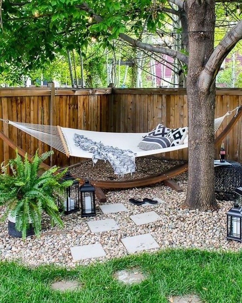 Using an arc hammock stand, @conniegrant1 created an enviable relaxation corner. We are particularly in love with the black accents and added stepping stones.