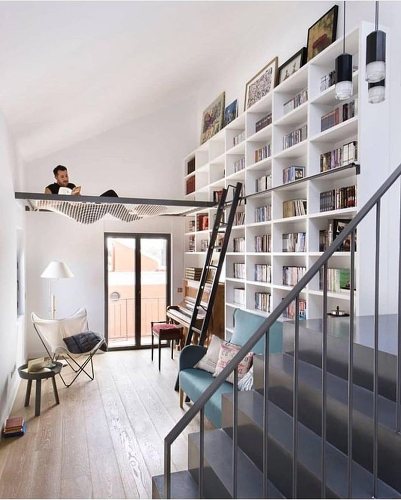 Thanks to design firm @egueyseta, we now want a bookcase wall with a built-in hammock area. Imagine how fun it would be to read up there. To make this idea more doable, you can simply hang a hammock from the ceiling near your bookcase to create a cozy reading nook.
