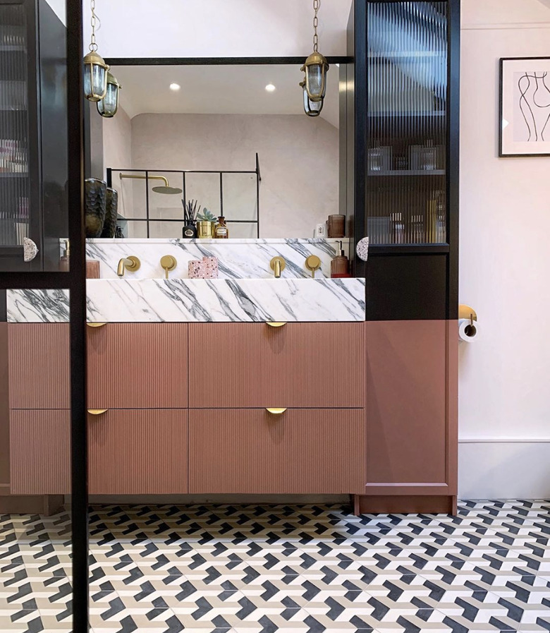 If texture is the name of the game for your bathroom reno, consider using IKEA bathroom vanities as the base for some funky wood paneling. You can even use timber dowels to add interest to the space. Get your IKEA DIY on!