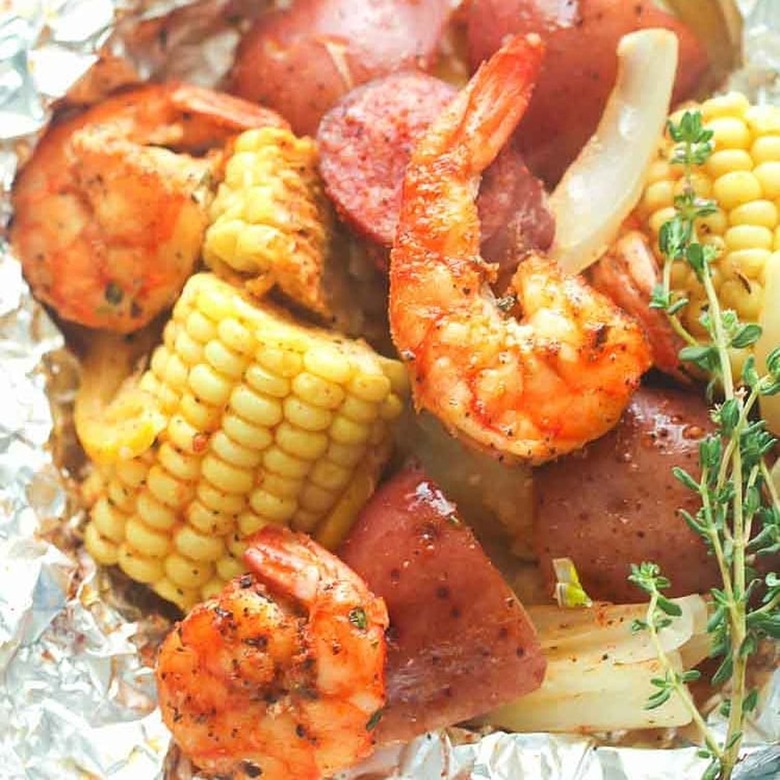 "[An] easy and tasty classic shrimp boil in foil packs with shrimps, baby red potatoes, corn on the cobs and andouille sausages generously seasoned with creole seasoning and garnished with lemon for a fresh and vibrant summer outdoor meal," reads the recipe description. Once you're done baking and boiling this beauty, you put it on the grill to finish it off. We're sold.