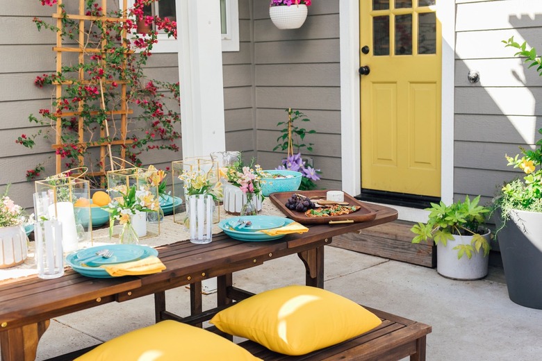 You can't have a fantastic tablescape without a centerpiece of some kind (it's just a fact). "For this tablescape, I used a trio of gold and glass lanterns placed on the natural runner, and then added a mixture of spring-colored flowers in mini vases and potted thyme," Sullivan says.