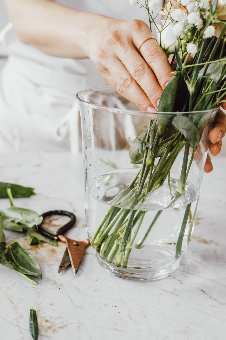 Prep the flowers by giving the bottom of all of the stems a diagonal cut of at least a 1/2 inch with sharp scissors. Air bubbles get trapped at the base of the stems, which limits the flower's ability to draw in water. A quick trim removes the blockage so the flower can suck up the fresh water supply, which is key to staying fresh longer. Before new air bubbles can form, move quickly to this next step.