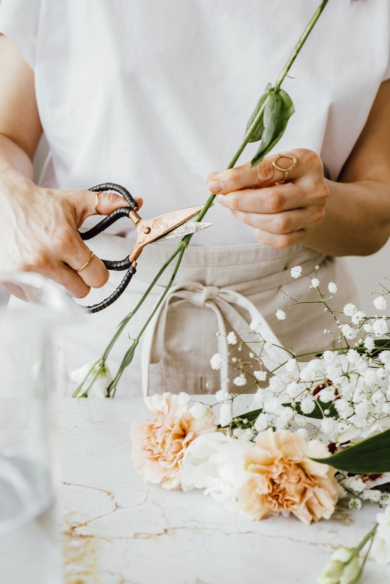 Have the vase and water ready to go because you should place the flowers in water immediately after trimming the ends to help keep new air bubbles from forming. One trick is to arrange the flowers before cutting them. Hold the bouquet in one hand and position the flowers to your liking. When you're happy with how it looks then cut the ends with the other hand and quickly stick the stems in water.
