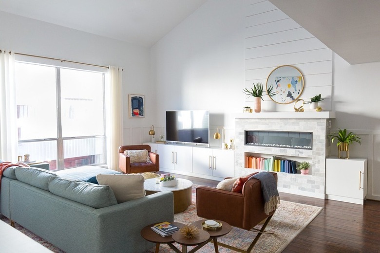 If a fireplace is part of your home design, you can create a standout shiplap accent wall behind the mantel that's similar to this one from Sugar and Cloth. If you don't have a fireplace, fear not. You can get a similar look by adding a bookshelf or media console in front of the shiplap feature.