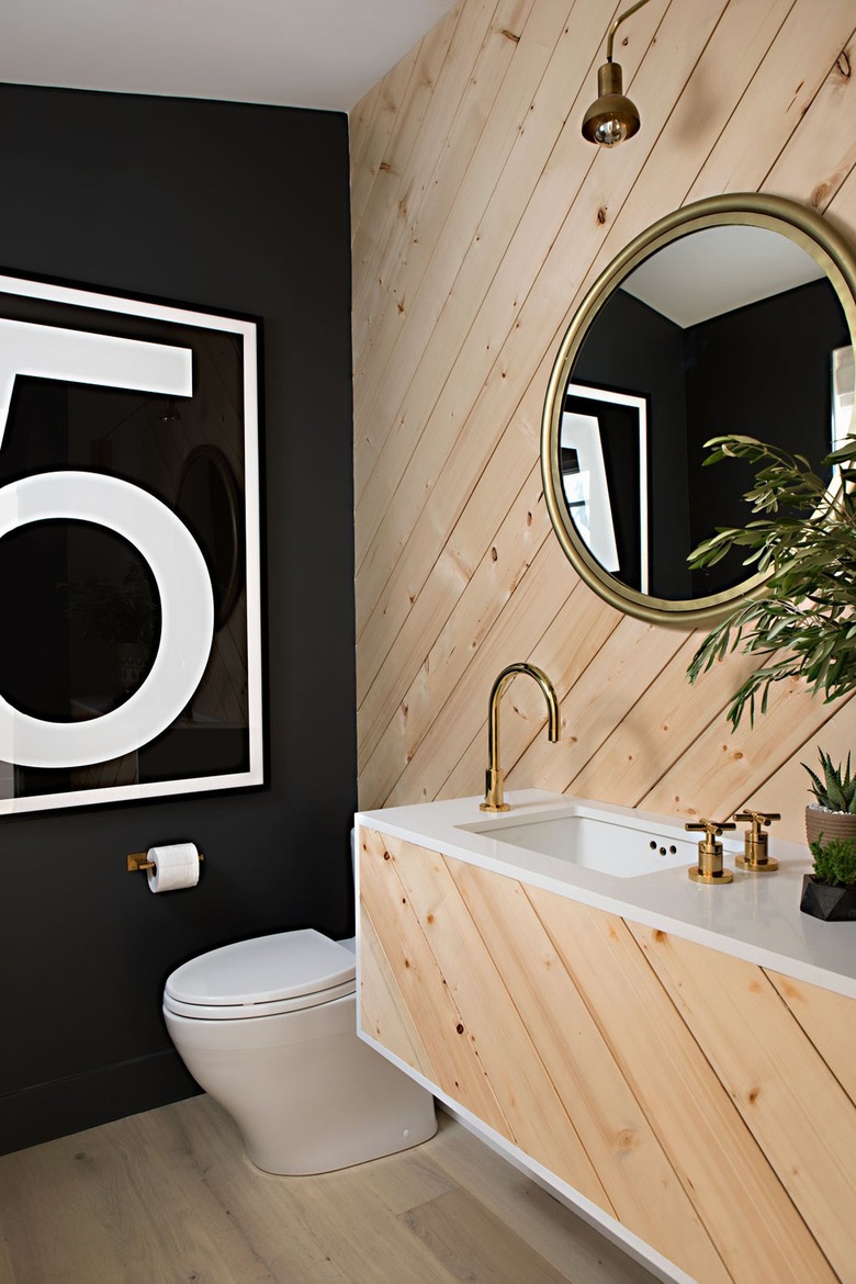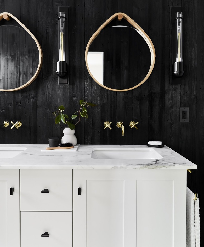 There's nothing wrong with a neutral or white bathroom that features a subtle interior design. But if you want an industrial backsplash, go for a moody black color palette like this one from Emily Henderson. A wall of rustic wood serves as the backsplash, and the marble countertop and white vanity add contrast.