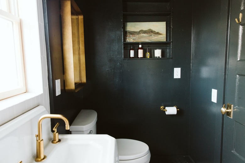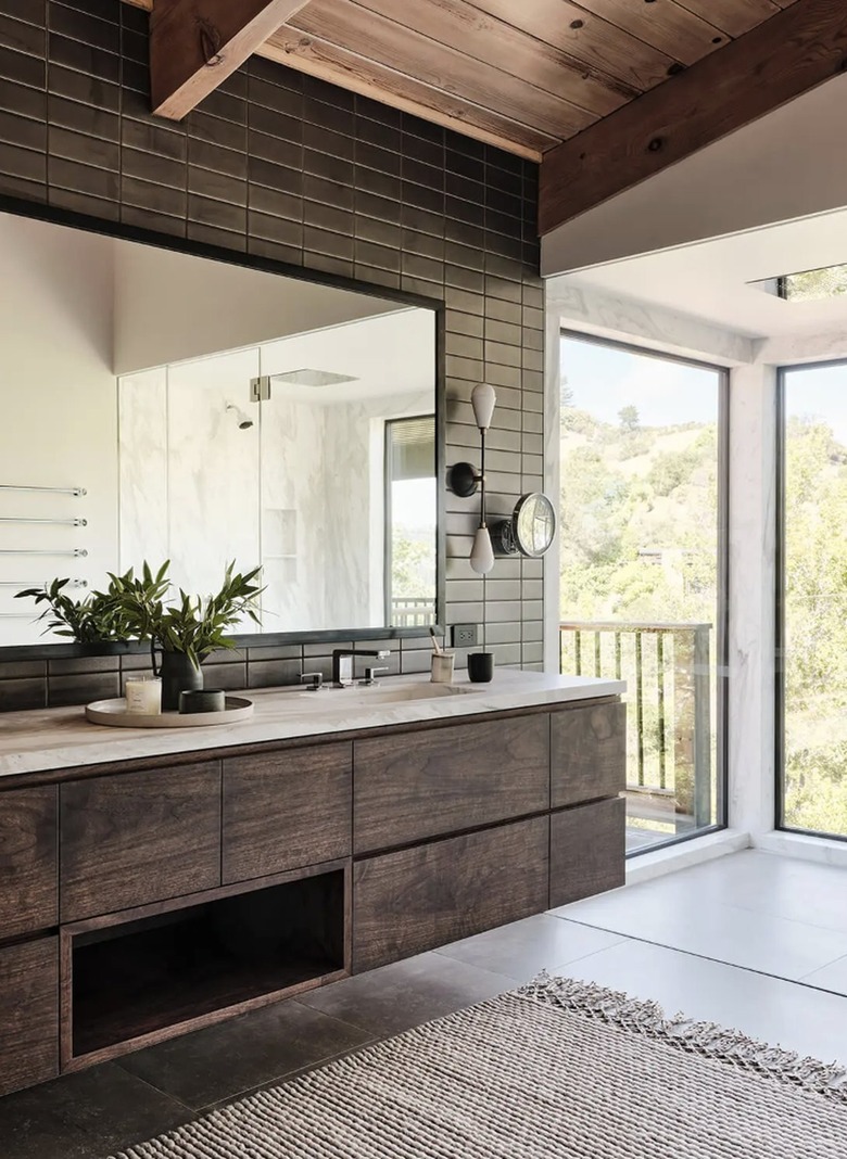 This farmhouse-meets-industrial space from Raili Ca Design introduces an inky black color through the bathroom tile. For a similar look, take yours from floor to ceiling, and the end result will be industrial drama that feels cozy instead of cold. Pro tip: Don't install wall sconces into the subway tile if you go this route. Try statement-making overhead lights instead.