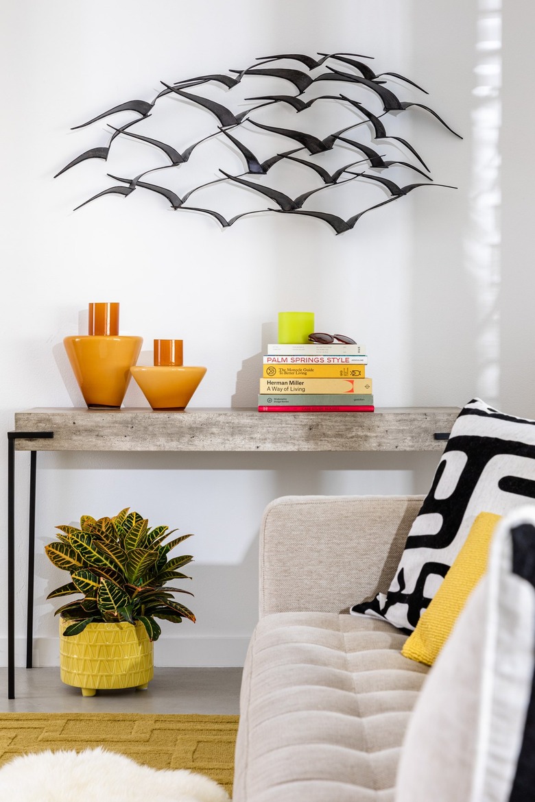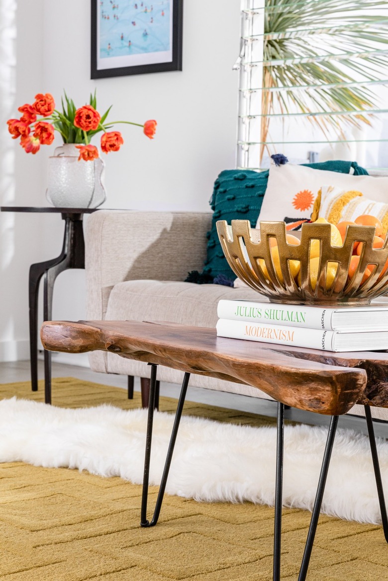 First, ground the space with neutral hues. A mid-century sofa in a soft beige does the job, along with a rustic, live-edge coffee table to blend a bit of boho into the mix. The muted palette allows a bright accent chair to pop, plus sets the stage for more colorful styling details.