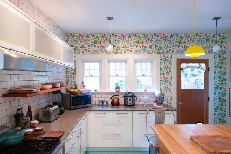 Turn up the retro charm with some floral wallpaper. This vintage kitchen look will be charming in a cottage or bungalow, but try a removable version if you rent.
