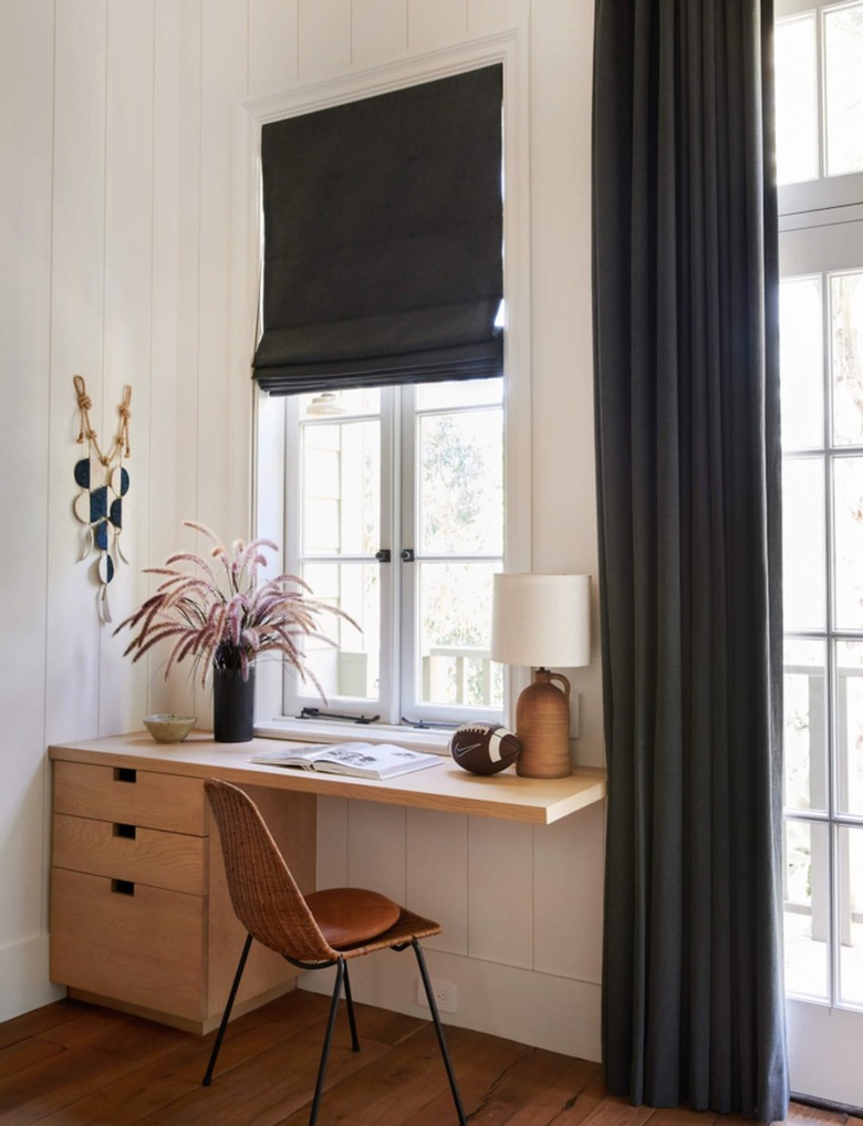 Want a fun way to light up your small home office space? Add accent lighting in a tone that complements your desk. Here, Amber Interiors went with a terra cotta lamp that features the same warm hues that are prominent in the small desk. A white shade brings everything together for a look that's cohesive and conducive to all kinds of computer work.